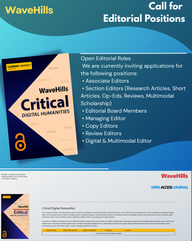Critical Digital Humanities, an interdisciplinary, peer-reviewed, open-access journal dedicated to critically examining digital cultures, technologies, and power through humanities-based perspectives hosted by The Learners’ University, and published by WaveHills, invites applications and expressions of interest for multiple editorial roles.